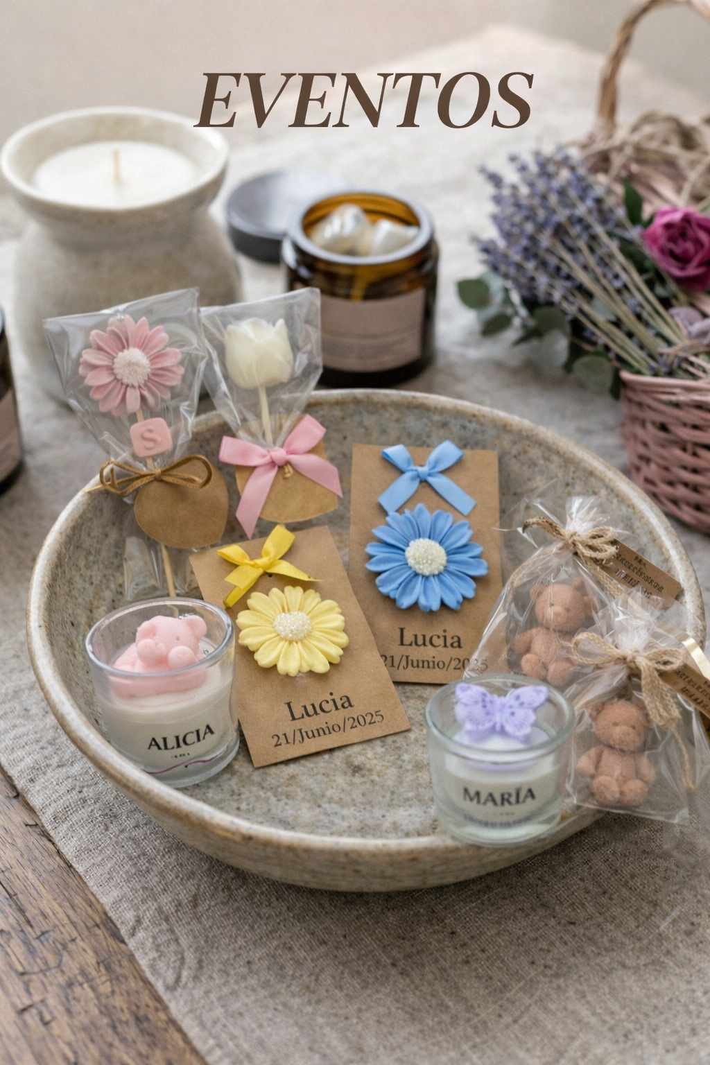 Creamos centros de mesa, velas decorativas y detalles únicos para bodas, comuniones, cumpleaños, bautizos y otros momentos especiales. Adaptamos los diseños, aromas, colores y presentaciones según el estilo de tu evento, logrando piezas exclusivas y totalmente personalizadas.