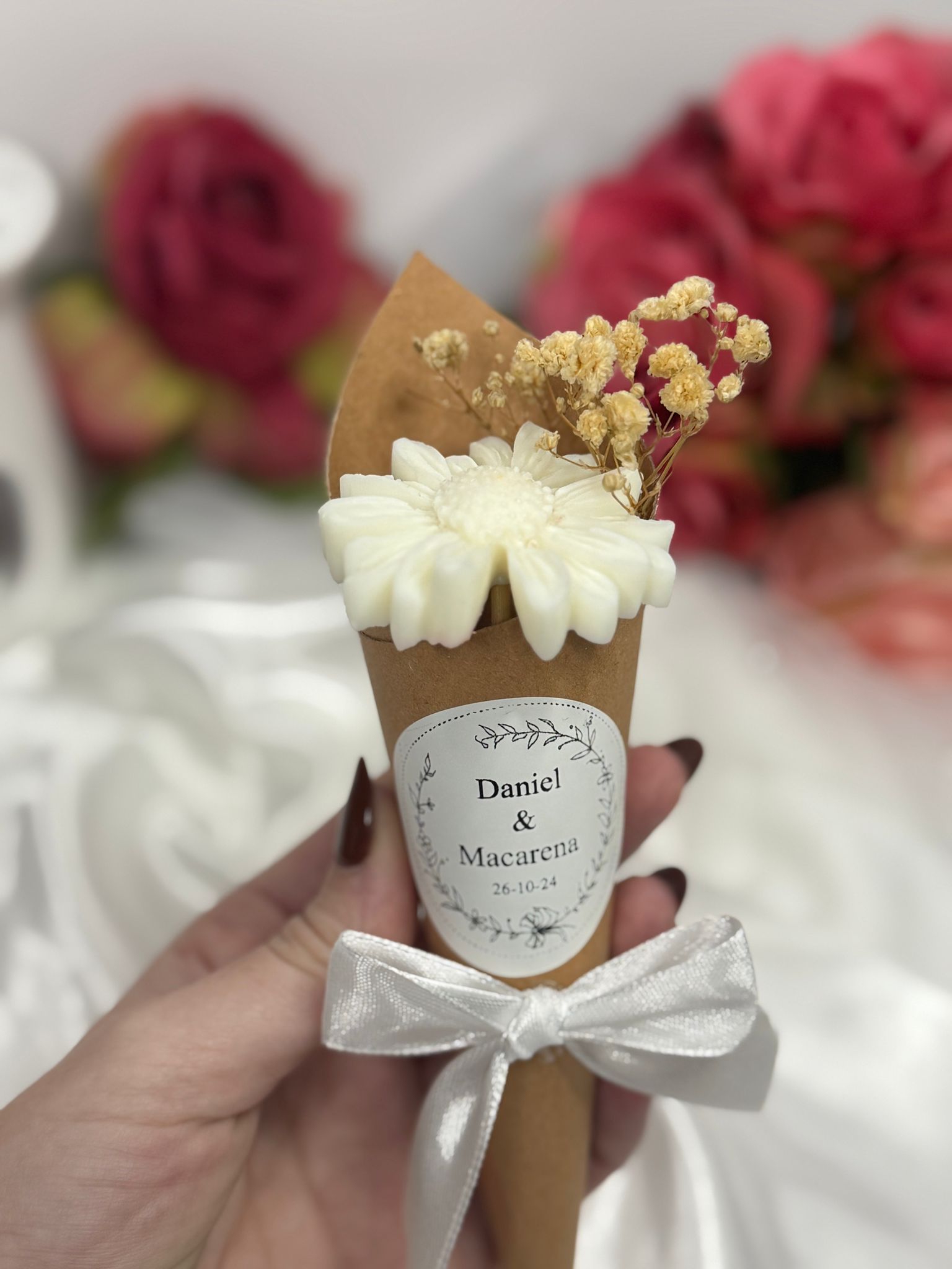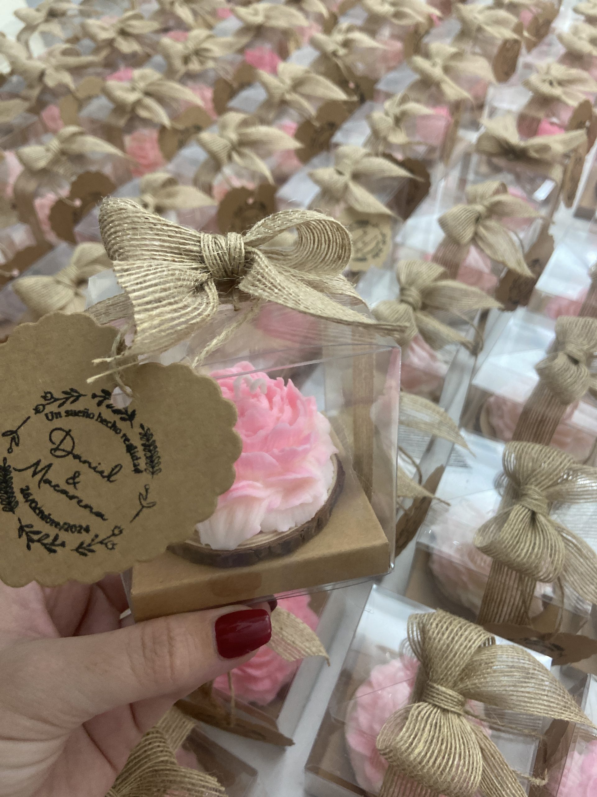 Realizamos detalles personalizados con cera de soja para tus eventos, elaborados con total dedicación y utilizando materiales naturales y respetuosos con el entorno. Cada pieza es creada a mano, cuidando cada detalle para ofrecerte un producto único, elegante y especial, pensado para transmitir sensaciones y hacer que cada celebración sea aún más memorable.
